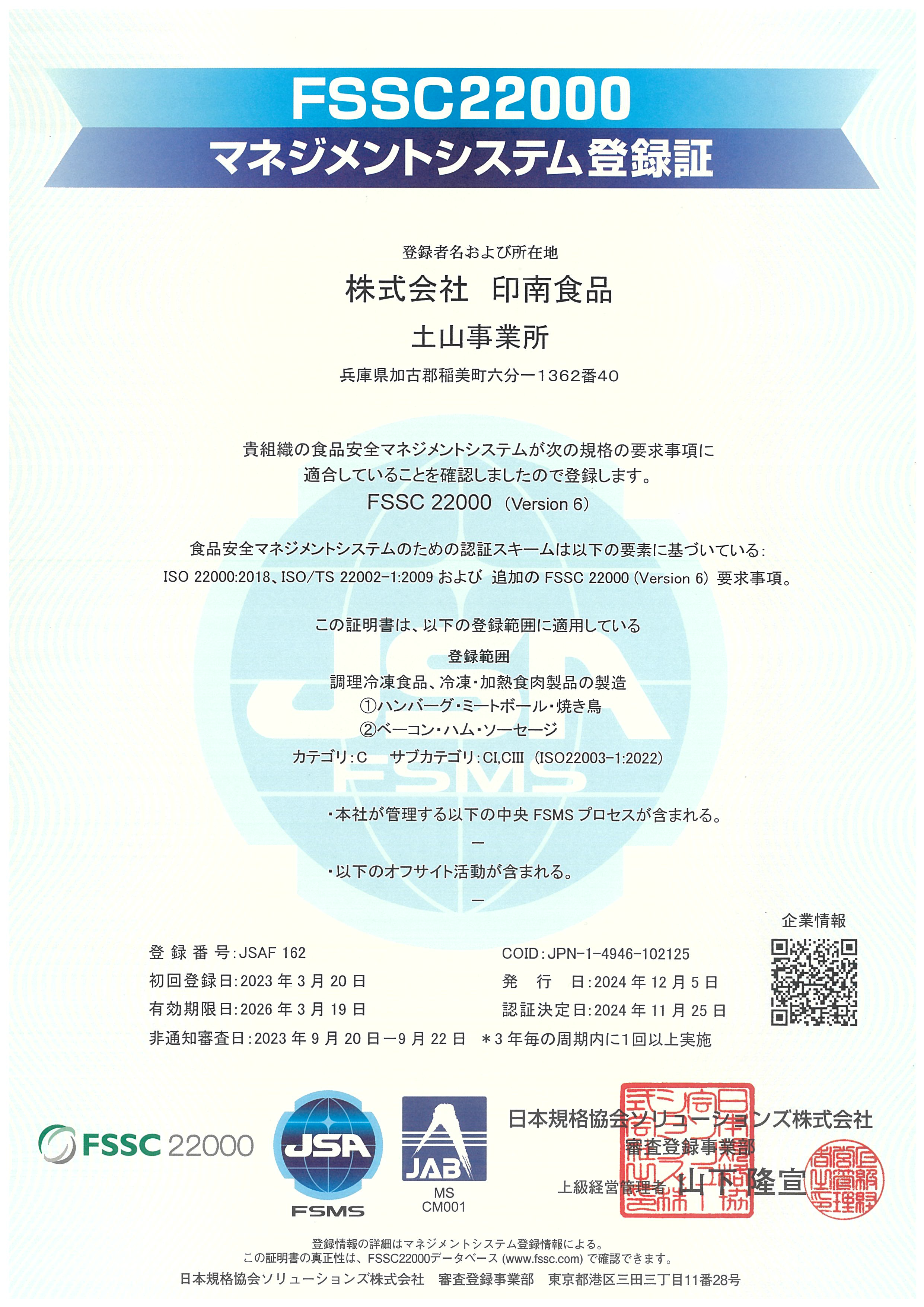 姫路事業所では、HACCPの考え方に準じた衛生・品質管理体制を構築するため、2023年8月に「JFS-B適合証明」を取得しました。危害分析、管理方法の決定、また定期監査による運用確認を行っています。また品質保証体制の維持・改善を継続的に行い、安全・安心で高品質な商品の提供に努めています。